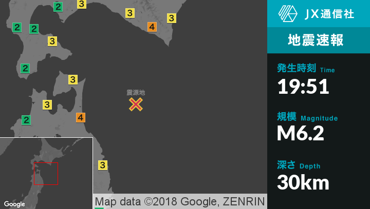 | 震度3 | 浦河町, えりも町, 新篠津村, 札幌北区, 千歳市, 恵庭市, 函館市, 南幌町, 長沼町, 苫小牧市, 厚真町, 安平町, むかわ町, 新冠町, 新ひだか町, 帯広市, 芽室町, 幕別町, 浦幌町, 十勝大樹町, 釧路市, 十和田市, 三沢市, 六戸町, 横浜町, 東北町, 六ヶ所村, 三戸町, 階上町, 新郷村, 青森市, 平内町, 外ヶ浜町, むつ市, 東通村, 二戸市, 八幡平市, 滝沢市, 岩手町, 紫波町, 矢巾町, 軽米町, 九戸村, 一戸町, 久慈市, 普代村, 岩手洋野町, 花巻市, 北上市, 奥州市, 登米市, 涌谷町, 石巻市 |