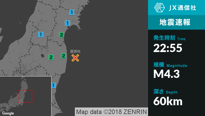 | 震度1 | 白石市, 名取市, 蔵王町, 大河原町, 柴田町, 宮城川崎町, 丸森町, 亘理町, 登米市, 大崎市, 宮城加美町, 宮城美里町, 南三陸町, 仙台青葉区, 仙台宮城野区, 仙台若林区, 仙台泉区, 石巻市, 塩竈市, 多賀城市, 東松島市, 松島町, 七ヶ浜町, 利府町, 大郷町, 大衡村, 福島市, 郡山市, 白河市, 国見町, 鏡石町, 天栄村, 泉崎村, 棚倉町, 矢祭町, 石川町, 玉川村, 平田村, 古殿町, 南相馬市, 福島広野町, 富岡町, 大熊町, 葛尾村, 一関市, 米沢市, 日立市, 常陸大宮市, 大子町 |
