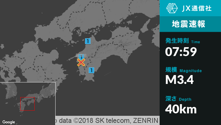 | 震度1 | 伊予市, 砥部町, 宇和島市, 八幡浜市, 西予市, 内子町, 伊方町, 松野町, 愛媛鬼北町, 宿毛市 |