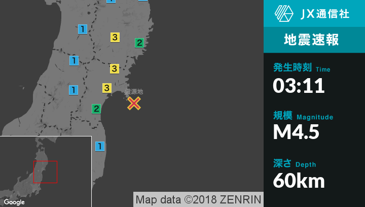 | 震度3 | 一関市, 登米市, 石巻市 |