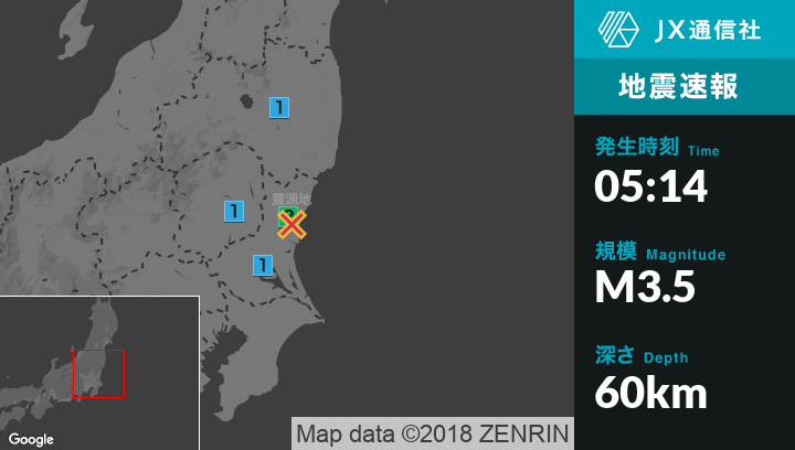 | 震度1 | 水戸市, 日立市, 常陸太田市, 笠間市, ひたちなか市, 常陸大宮市, 東海村, 土浦市, 石岡市, 筑西市, かすみがうら市, 桜川市, 白河市, 真岡市, 茂木町 |
