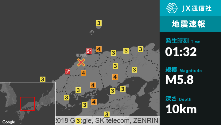| 震度5弱 | 川本町, 島根美郷町, 出雲市, 雲南市 |