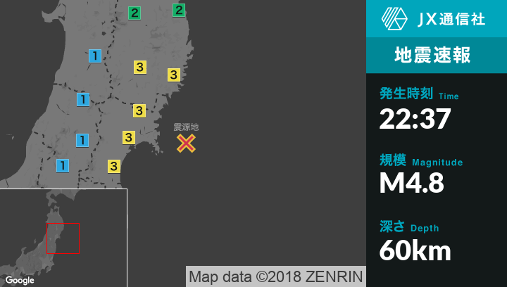 | 震度1 | 大槌町, 西和賀町, 久慈市, 普代村, 盛岡市, 八幡平市, 葛巻町, 紫波町, 九戸村, 白石市, 角田市, 村田町, 丸森町, 仙台太白区, 八戸市, 五戸町, 青森南部町, 福島市, 郡山市, 白河市, 須賀川市, 二本松市, 桑折町, 国見町, 大玉村, 鏡石町, 天栄村, 石川町, 玉川村, 平田村, 浅川町, 小野町, いわき市, 南相馬市, 福島広野町, 楢葉町, 富岡町, 川内村, 大熊町, 双葉町, 浪江町, 葛尾村, 新地町, 横手市, 大仙市, 仙北市, 東成瀬村, 新庄市, 最上町, 舟形町, 大蔵村, 戸沢村, 寒河江市, 天童市, 東根市, 尾花沢市, 山辺町, 中山町, 河北町, 山形朝日町, 大石田町, 米沢市, 日立市, 笠間市 |