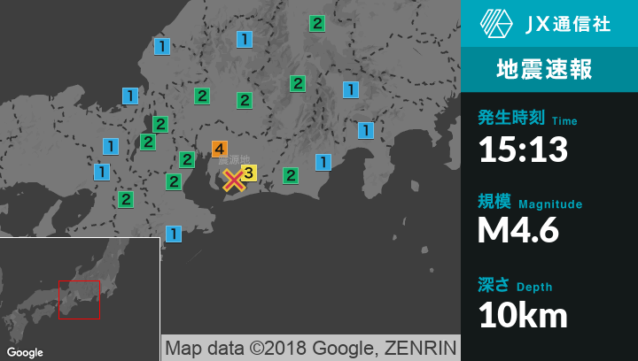 | 震度2 | 名古屋千種区, 名古屋北区, 名古屋西区, 名古屋中区, 名古屋昭和区, 名古屋瑞穂区, 名古屋熱田区, 名古屋港区, 名古屋南区, 名古屋守山区, 名古屋名東区, 名古屋天白区, 一宮市, 尾張旭市, 豊明市, 日進市, 愛西市, 長久手市, 東郷町, 蟹江町, 南知多町, 武豊町, 豊橋市, 新城市, 田原市, 茅野市, 泰阜村, 多治見市, 瑞浪市, 恵那市, 土岐市, 岐阜市, 浜松天竜区, 四日市市, 鈴鹿市, 松阪市, 高島市, 甲賀市, 東近江市, 滋賀日野町, 竜王町, 高取町 |