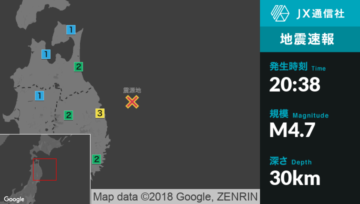 | 震度2 | 宮古市, 野田村, 釜石市, 盛岡市, 二戸市, 八幡平市, 矢巾町, 軽米町, 八戸市, 野辺地町, 三戸町, 五戸町, 青森南部町, 階上町 |