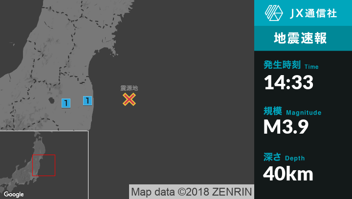 | 震度1 | 田村市, いわき市, 相馬市, 楢葉町, 双葉町, 浪江町 |