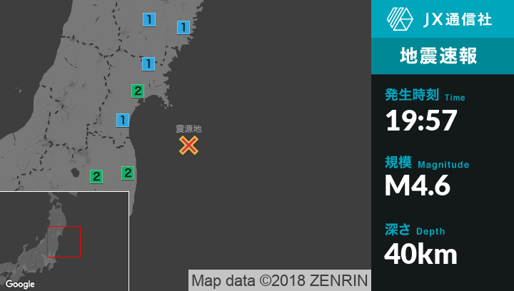 | 震度2 | 石巻市, 女川町, 田村市, いわき市, 南相馬市, 楢葉町, 川内村, 双葉町, 浪江町, 飯舘村 |