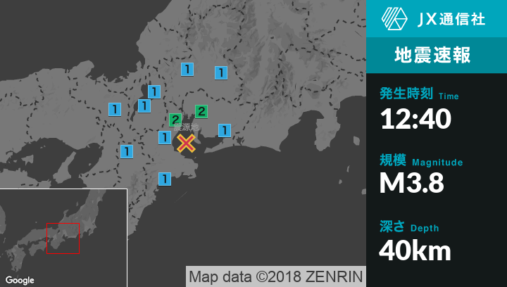 | 震度1 | 名古屋千種区, 名古屋東区, 名古屋北区, 名古屋西区, 名古屋中区, 名古屋昭和区, 名古屋瑞穂区, 名古屋南区, 名古屋緑区, 名古屋名東区, 岡崎市, 一宮市, 刈谷市, 豊田市, 西尾市, 犬山市, 常滑市, 小牧市, 稲沢市, 東海市, 大府市, 知多市, 尾張旭市, 日進市, 愛西市, 清須市, 弥富市, 愛知みよし市, あま市, 長久手市, 東郷町, 蟹江町, 飛島村, 阿久比町, 南知多町, 愛知美浜町, 武豊町, 豊川市, 蒲郡市, 新城市, 田原市, 鈴鹿市, 亀山市, 松阪市, 伊賀市, 伊勢市, 恵那市, 土岐市, 川辺町, 大垣市, 羽島市, 各務原市, 瑞穂市, 岐南町, 輪之内町, 大野町, 彦根市, 高島市, 大津市, 野洲市, 湖南市, 東近江市, 滋賀日野町, 竜王町, 京都伏見区, 京都西京区, 宇治市, 城陽市, 木津川市, 宇治田原町, 精華町, 南山城村, 奈良市, 桜井市, 宇陀市, 山添村, 曽爾村, 高取町 |