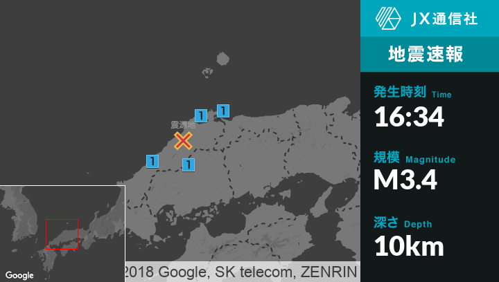 | 震度1 | 鳥取日野町, 出雲市, 雲南市, 飯南町, 大田市, 島根美郷町, 邑南町, 安芸高田市 |