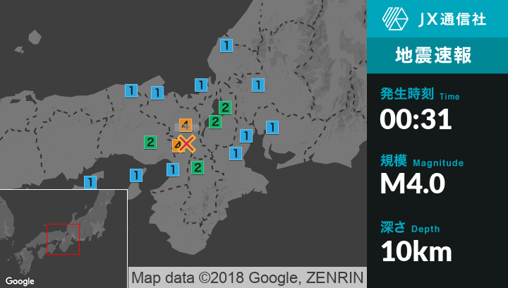 | 震度2 | 京都北区, 京都上京区, 京都左京区, 京都東山区, 京都下京区, 京都南区, 京都右京区, 京都山科区, 京田辺市, 宇治田原町, 精華町, 京丹波町, 大阪都島区, 大阪東淀川区, 大阪旭区, 大阪淀川区, 大阪北区, 豊中市, 池田市, 吹田市, 茨木市, 寝屋川市, 摂津市, 四條畷市, 能勢町, 長浜市, 大津市, 草津市, 栗東市, 東近江市, 川西市, 三田市, 大和郡山市, 高取町 |