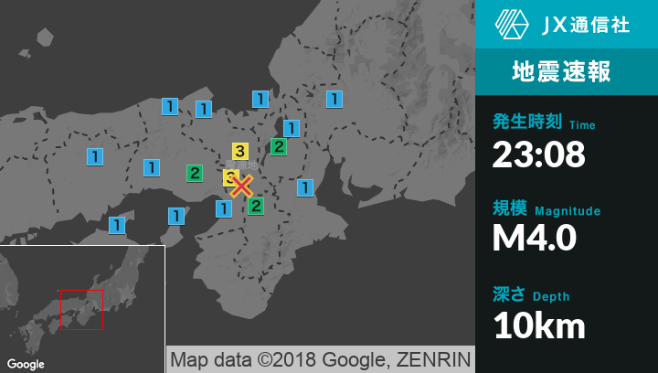| 震度2 | 京都中京区, 京都下京区, 京都南区, 京都西京区, 宇治市, 亀岡市, 城陽市, 向日市, 長岡京市, 京田辺市, 南丹市, 井手町, 精華町, 京丹波町, 大阪都島区, 大阪福島区, 大阪西淀川区, 大阪東淀川区, 大阪旭区, 大阪淀川区, 豊中市, 池田市, 吹田市, 高槻市, 守口市, 茨木市, 寝屋川市, 大東市, 門真市, 摂津市, 四條畷市, 島本町, 豊能町, 能勢町, 大津市, 尼崎市, 明石市, 西宮市, 宝塚市, 川西市, 三田市, 篠山市, 奈良市, 大和郡山市, 天理市, 桜井市, 御所市, 生駒市, 宇陀市, 奈良川西町, 高取町, 広陵町, 吉野町 |