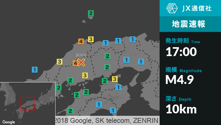 | 震度2 | 松江市, 出雲市, 浜田市, 大田市, 江津市, 海士町, 隠岐の島町, 安芸太田町, 北広島町, 福山市, 広島府中市, 世羅町, 広島中区, 広島東区, 広島西区, 広島安佐南区, 広島安佐北区, 広島安芸区, 広島佐伯区, 呉市, 竹原市, 大竹市, 東広島市, 廿日市市, 江田島市, 府中町, 海田町, 熊野町, 坂町, 米子市, 日吉津村, 鳥取南部町, 日南町, 鳥取日野町, 小豆島町, 坂出市, 観音寺市, 三豊市, 新見市, 真庭市, 鏡野町, 岡山南区, 倉敷市, 玉野市, 笠岡市, 総社市, 高梁市, 赤磐市, 浅口市, 和気町, 早島町, 里庄町, 矢掛町, 岩国市, 柳井市, 周防大島町, 田布施町, 平生町, 今治市, 上島町, 松山市, 八幡浜市 |
