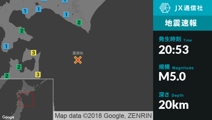 | 震度1 | 十和田市, 六ヶ所村, 田子町, 新郷村, 大間町, 五所川原市, つがる市, 今別町, 蓬田村, 板柳町, 鶴田町, 中泊町, 弘前市, 黒石市, 平川市, 鰺ヶ沢町, 田舎館村, 七飯町, 浦河町, えりも町, 江別市, 千歳市, 福島町, 木古内町, 胆振伊達市, 苫小牧市, 登別市, 厚真町, むかわ町, 日高地方日高町, 新ひだか町, 二戸市, 雫石町, 葛巻町, 岩手町, 紫波町, 九戸村, 宮古市, 久慈市, 普代村, 野田村, 岩手洋野町, 花巻市, 北上市, 遠野市, 一関市, 奥州市, 登米市, 石巻市, 井川町, 大館市, 鹿角市, 小坂町 |