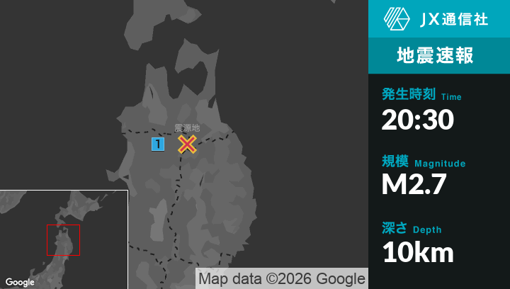 1月9日 20時30分頃発生した地震(最大震度1)