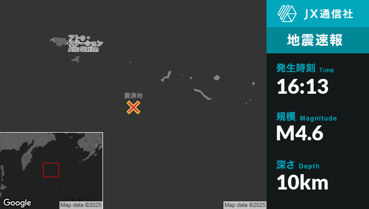 6月29日 16:13頃、アラスカのAttu Stationから南東266kmの地点でM4.6の地震がありました。