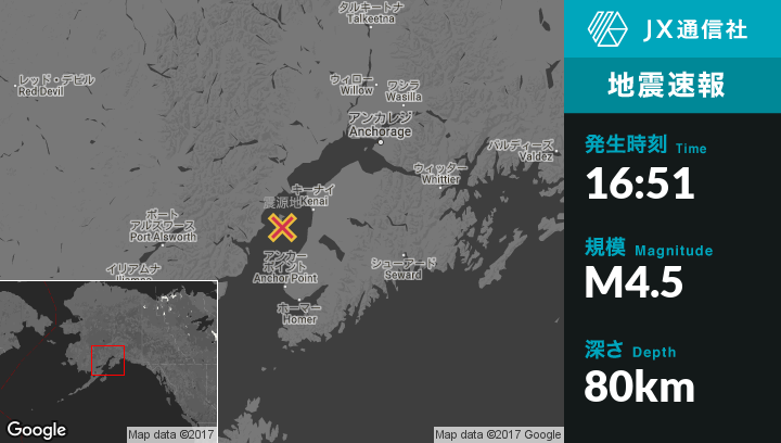 8月27日 16:51頃、アラスカのKalifornskyから西33kmの地点でM4.5の地震がありました。