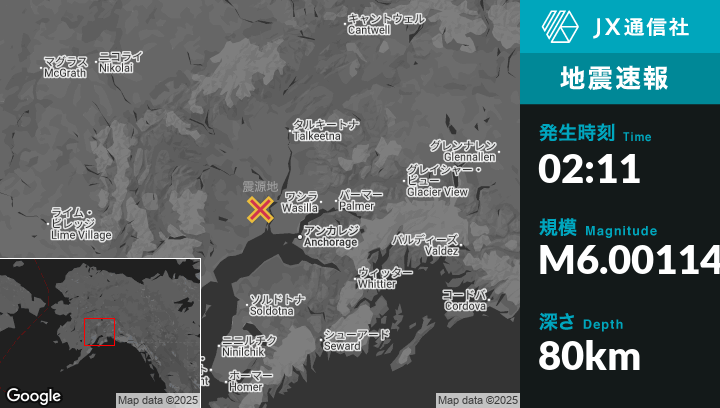 | 震源地 | アラスカのSusitnaから西14kmの地点 |