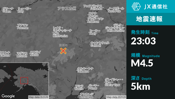 | 震源地 | アラスカのDenali National Parkから南南東45kmの地点 |