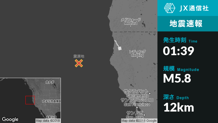 1月26日 01:39頃、カリフォルニアのFerndaleから西204kmの地点でM5.8の地震がありました。