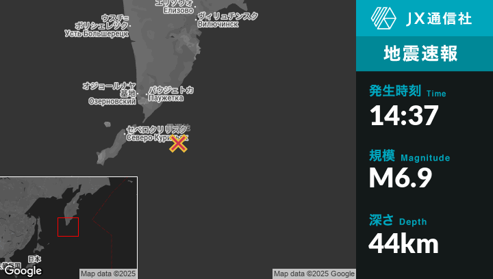 | 震源地 | ロシアのSevero-Kuril’skから東121kmの地点 |
