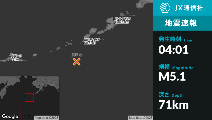 9月05日 04:01頃、アラスカのNikolskiから南南西99kmの地点でM5.1の地震がありました。