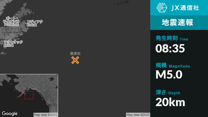 | 震源地 | アラスカのChiniakから南東262kmの地点 |