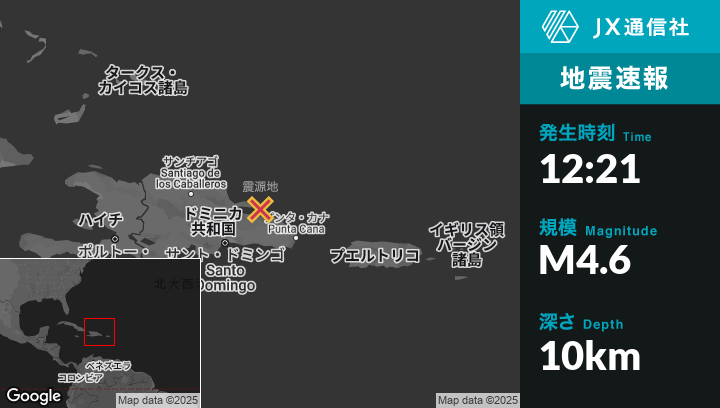 4月29日 12:21頃、ドミニカ共和国のSamanáから東北東19kmの地点でM4.6の地震がありました。