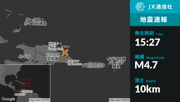 6月14日 15:27頃、ドミニカ共和国のSamanáから北東31kmの地点でM4.7の地震がありました。