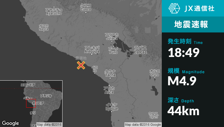 8月19日 18:49頃、ペルーのMollendoから西32kmの地点で地震がありました。
