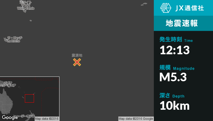 | 震源地 | ニューカレドニアのIle Hunterから東南東137kmの地点 |