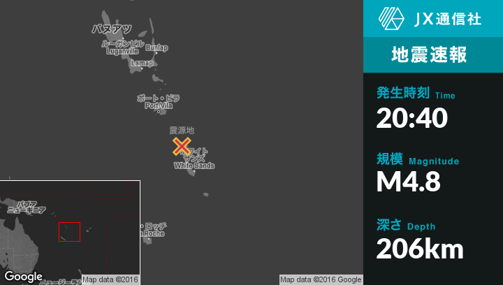 8月20日 20:40頃、バヌアツのIsangelから北北西101kmの地点で地震がありました。
