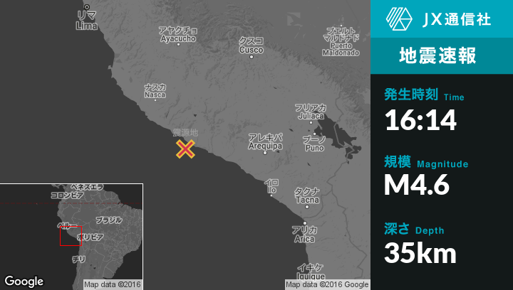 8月21日 16:14頃、ペルーのAcariから南東104kmの地点で地震がありました。
