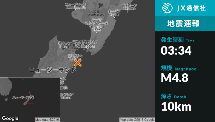 | 震源地 | ニュージーランドのBlenheimから南南東49kmの地点 |