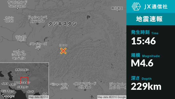 12月01日 15:46頃、アフガニスタンのJarmから東南東31kmの地点でM4.6の地震がありました。