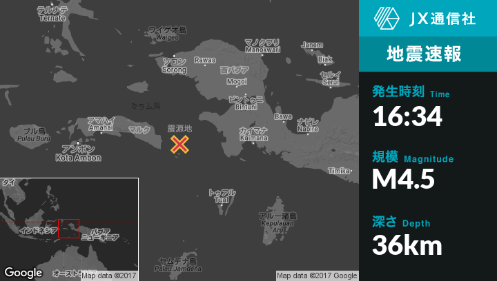 5月05日 16:34頃、インドネシアのTualから北北西274kmの地点でM4.5の地震がありました。