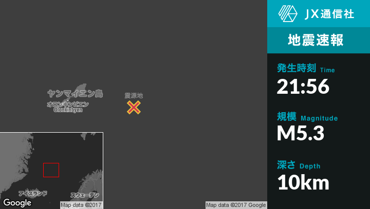 10月21日 21:56頃、スヴァールバルとヤン・マイエンのOlonkinbyenから東102kmの地点でM5.3の地震がありました。