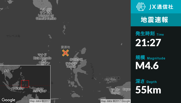 | 震源地 | インドネシアのTobeloから西北西140kmの地点 |