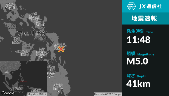 12月06日 11:48頃、フィリピンのSalcedoから東北東5kmの地点でM5.0の地震がありました。