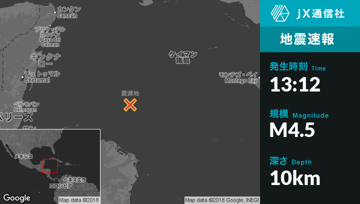 1月10日 13:12頃、ホンジュラスのGreat Swan Islandから東38kmの地点でM4.5の地震がありました。