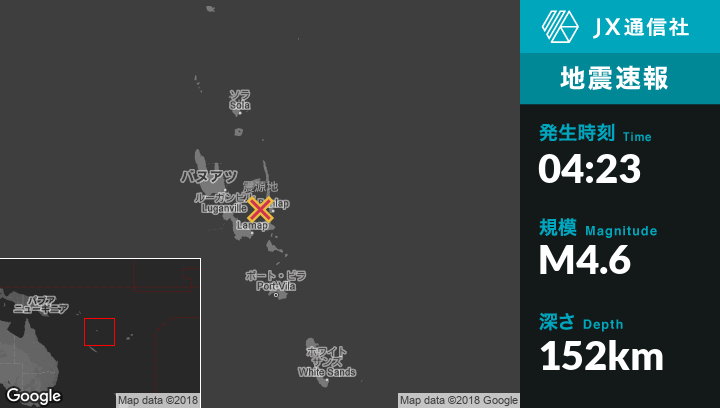 2月02日 04:23頃、バヌアツのNorsupから東北東69kmの地点でM4.6の地震がありました。