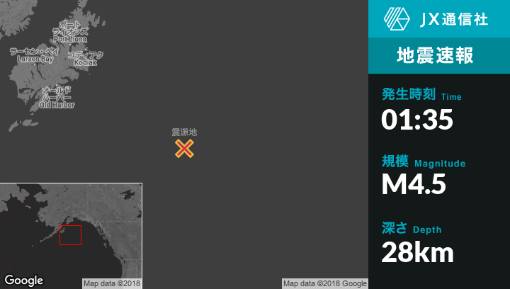 2月04日 01:35頃、アラスカのKodiakから南東257kmの地点でM4.5の地震がありました。