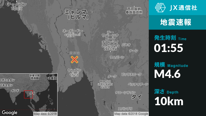 2月06日 01:55頃、ミャンマーのPyuから南西35kmの地点でM4.6の地震がありました。