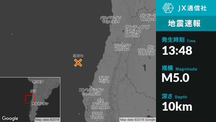 2月06日 13:48頃、チリのConstitucionから西144kmの地点でM5.0の地震がありました。