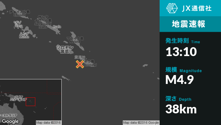 12月09日 13:10頃、ソロモン諸島のKirakiraから西72kmの地点でM4.9の地震がありました。