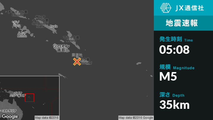 12月11日 05:08頃、ソロモン諸島のKirakiraから西64kmの地点でM5の地震がありました。