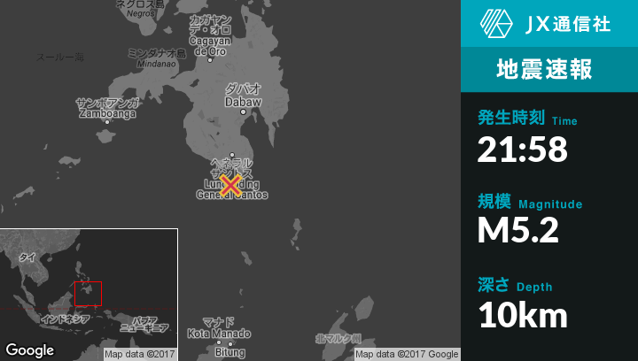 6月09日 21:58頃、フィリピンのBalangonanから西南西25kmの地点でM5.2の地震がありました。