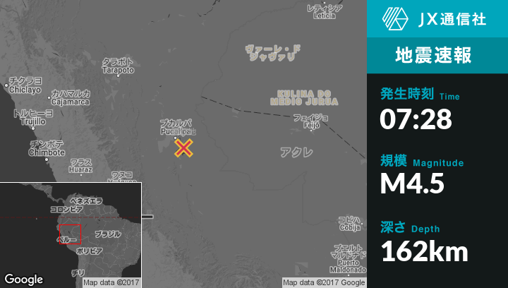 9月02日 07:28頃、ペルーのPucallpaから南東34kmの地点でM4.5の地震がありました。