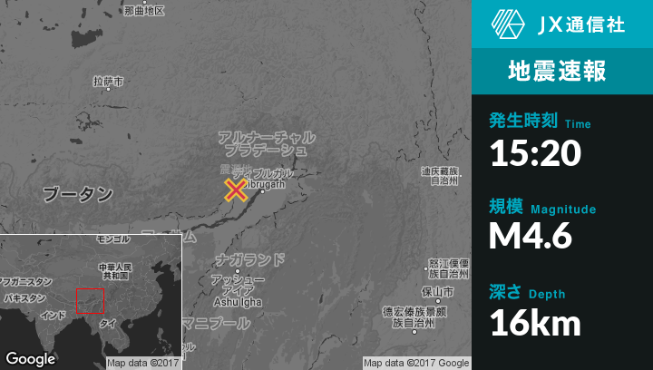12月17日 15:20頃、インドのDhemajiから西北西36kmの地点でM4.6の地震がありました。