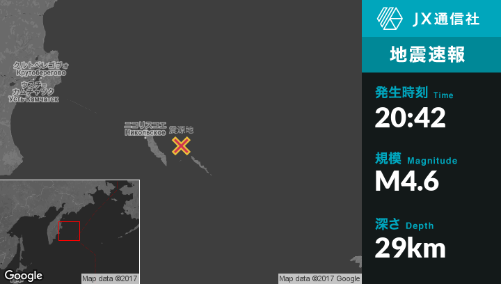 12月17日 20:42頃、ロシアのNikol'skoyeから東72kmの地点でM4.6の地震がありました。