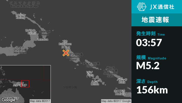 12月18日 03:57頃、パプアニューギニアのArawaから西北西95kmの地点でM5.2の地震がありました。